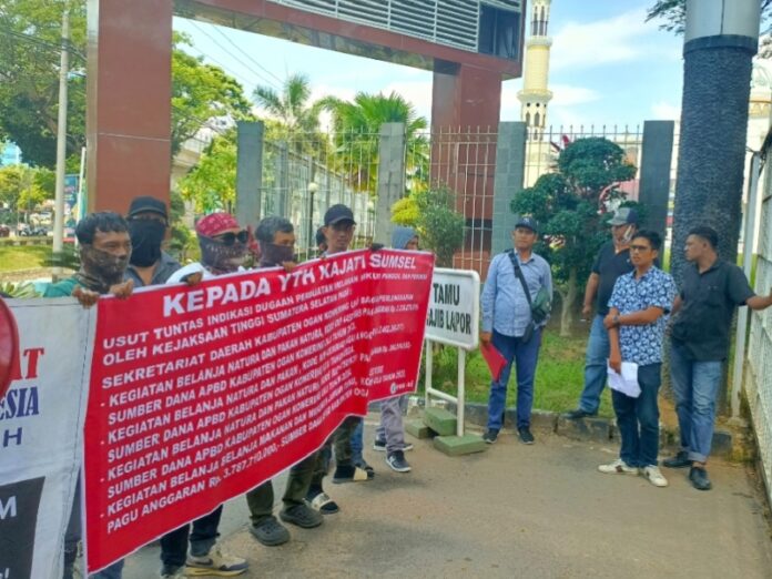 Sumsel.Kabar86.com, Palembang – POSE RI bersama Serikat Masyarakat Sumsel (SMS) melakukan aksi unjuk rasa di depan Kejaksaan Tinggi Sumatera Selatan, Kamis (04/07), menuntut penegakan hukum atas dugaan korupsi pada pengadaan perlengkapan di Bagian Hukum Sekretariat Daerah (Setda) Kabupaten Ogan Komering Ulu (OKU).